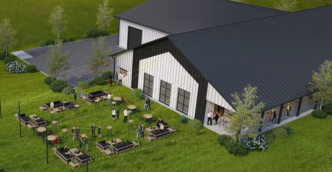 An outdoor social area with comfortable lounge seating, hi-top tables, yard games, and an outdoor bar service window for you and your guests to enjoy.
